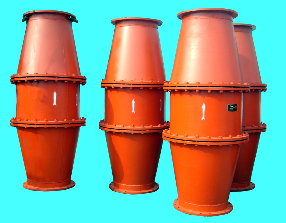 該產(chǎn)品由法蘭盤、異徑管、擋圈、進氣管、出氣管、錐筒體、圓鐵筒、阻火芯、密封件等組成。